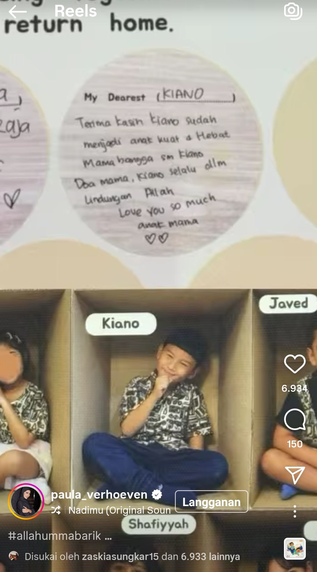 Pertama Paula Verhoeven menuliskan pesannya untuk Kiano, sang putra sulung. Model berhijab itu juga mengungkapkan perasaan sayangnya kepada sang buah hati.