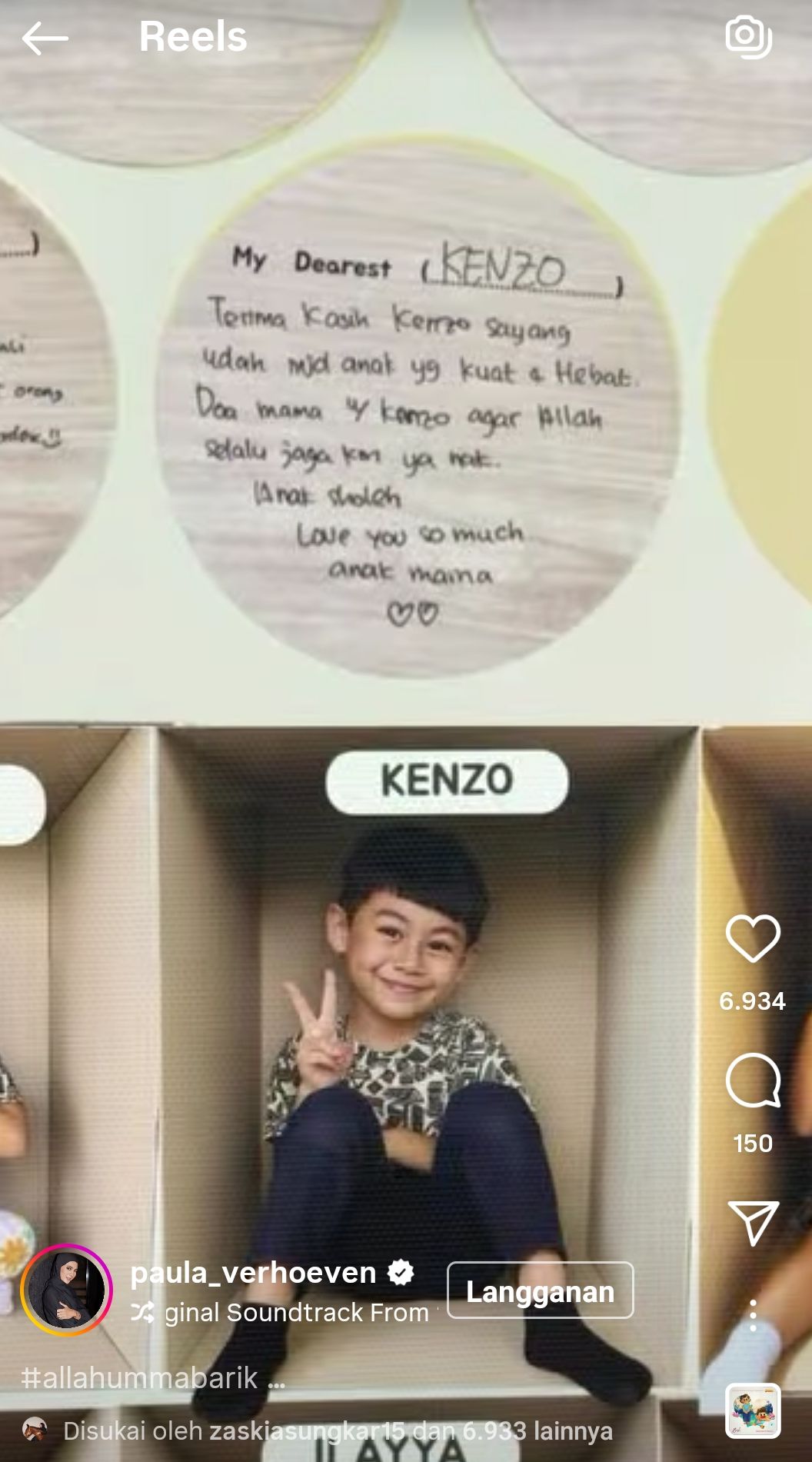 Selesai menuliskan pesan untuk Kiano, Paula Verhoeven kemudian menunjukkan foto Kenzo, sang putra bungsu. Sama seperti Kiano, Paula Verhoeven juga mengungkapkan perasaan cintanya pada Kenzo.
