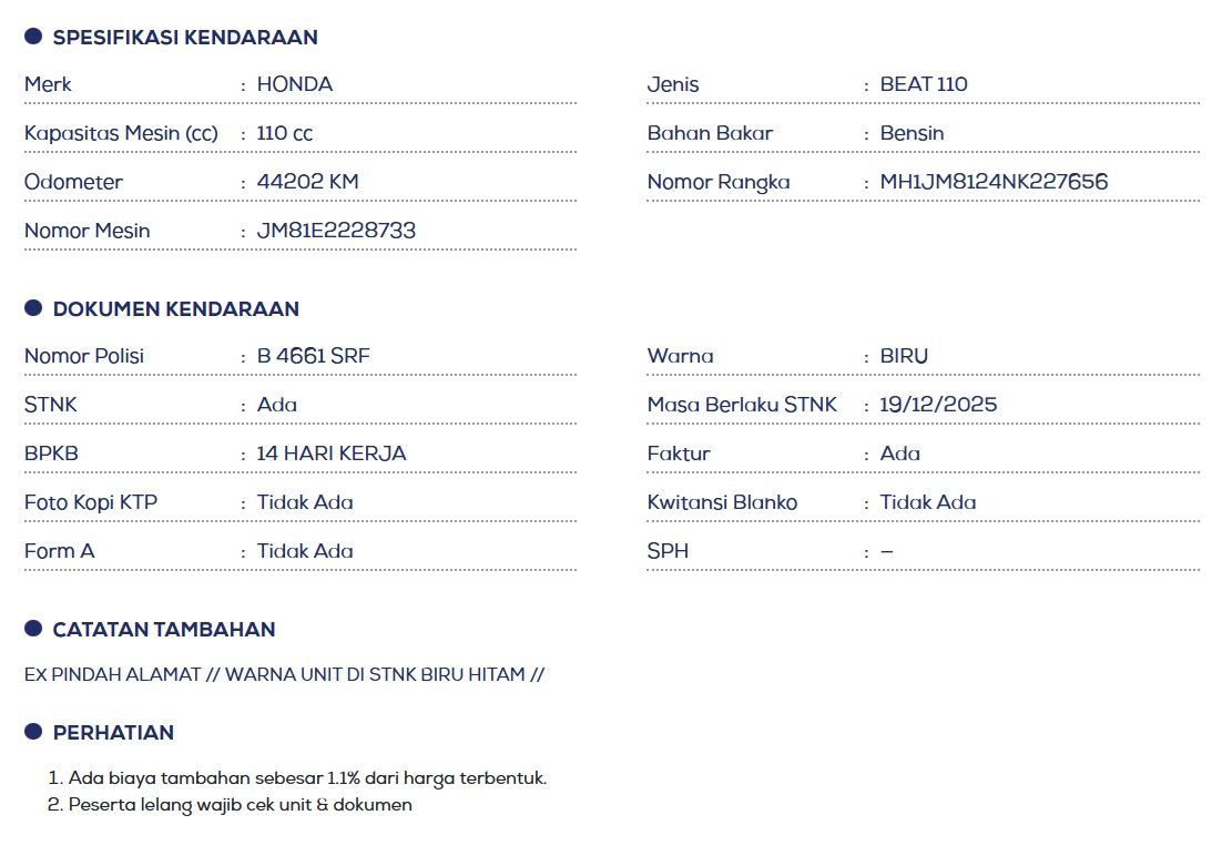 Rencananya satu unit Honda BeAT tahun 2022 akan dilelang mulai harga Rp 7,5 juta. Untuk lokasi lelang atau unit berada di JBA-Jakarta Raya. Skutik warna biru hitam ini akan dilelang di Jalan Husein Sastra Negara Komplek Pergudangan Nusa Indah – Jurumudi, Tangerang Banten.