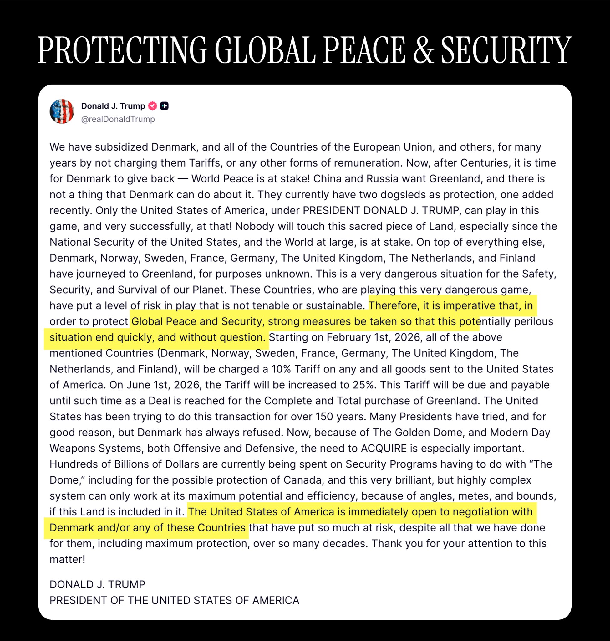 Dalam akhir pernyataannya, Trump tetap membuka ruang negosiasi bagi negara-negara yang dikenai tarif akibat aksi yang dinilainya berbahaya di Greenland. Ia menyampaikan bahwa saatnya bagi Denmark untuk mengembalikan Greenland, dengan menyatakan bahwa perdamaian dunia dipertaruhkan. Trump juga menyebut bahwa China dan Rusia memiliki keinginan untuk menguasai wilayah tersebut, dan tidak ada yang bisa dilakukan Denmark untuk mencegahnya.