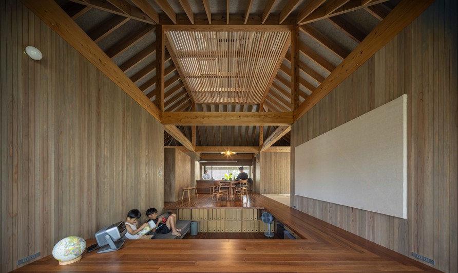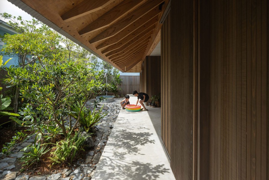 Bentuk atap rumah menjadi salah satu elemen kunci dalam merespons iklim. Terinspirasi dari tipologi atap tradisional Jepang, atap dirancang dengan kemiringan dan overhang yang dalam. Elemen ini berfungsi melindungi bangunan dari hujan deras sekaligus mengurangi panas matahari langsung. Material atap yang ringan dipadukan dengan sistem ventilasi tersembunyi untuk membantu mengalirkan udara panas ke luar.