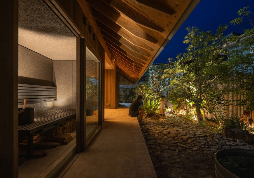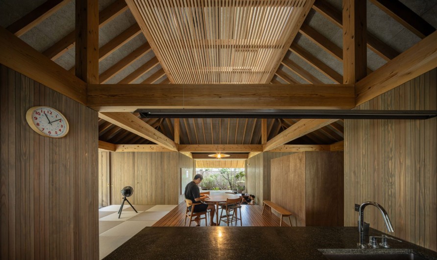 Secara komposisi, Amami House tidak hadir sebagai satu massa bangunan utuh. Rumah ini terdiri dari beberapa volume terpisah yang disusun mengikuti prinsip arsitektur tradisional lokal. Setiap volume memiliki fungsi spesifik, mulai dari ruang tidur, kamar mandi, hingga ruang penyimpanan. Pendekatan ini menciptakan jarak alami antar ruang sekaligus menghadirkan area transisi yang luas.