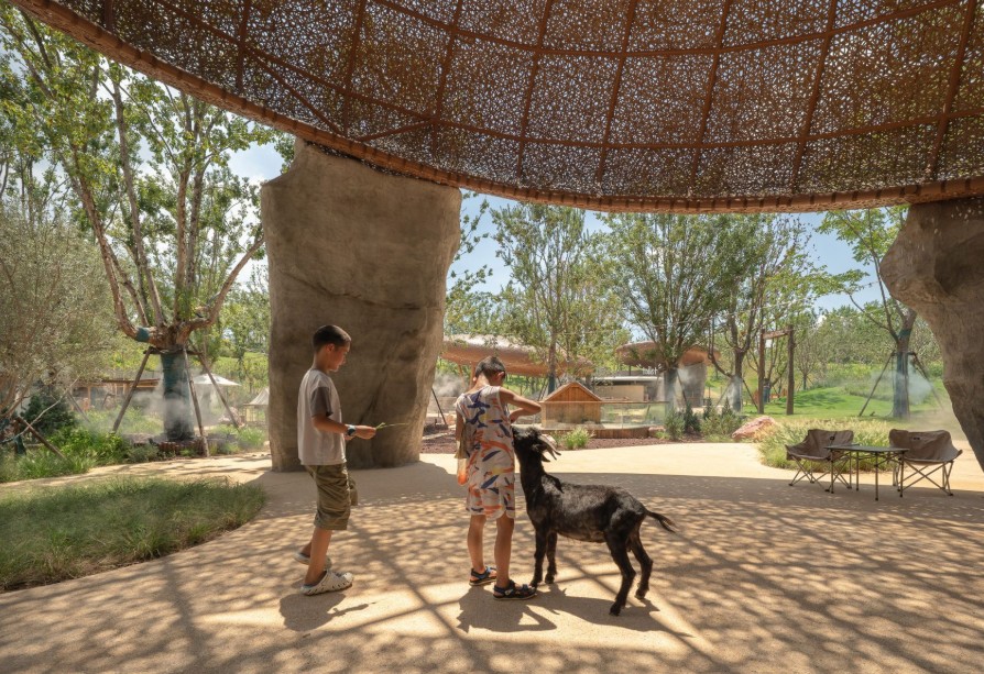Anyaman bambu membentuk atap dan kubah yang menaungi berbagai area, mulai dari ruang publik hingga zona interaksi dengan hewan. Material ini berfungsi menyaring cahaya, menciptakan bayangan lembut, serta memungkinkan sirkulasi udara alami. Ruang luar pun terasa teduh dan nyaman sepanjang hari.
