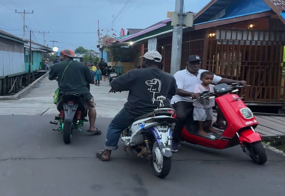 Masyarakat mengendarai motor listrik di Kota Agats, Asmat, Papua Selatan. Foto: Natalia Laurens/JPNN