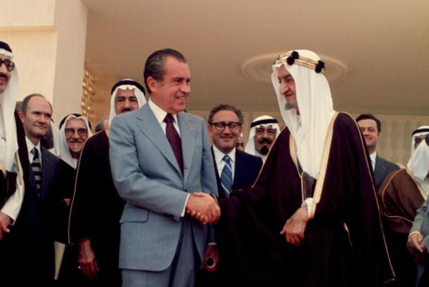 Presiden AS Richard Nixon menjabat tangan Raja Faisal di Saudi pada 1973. – (Public Domain)